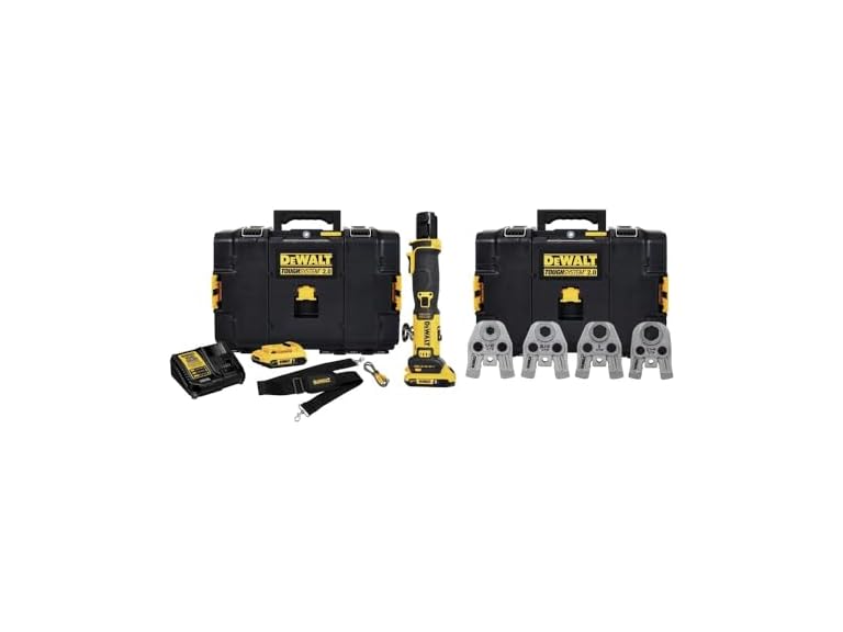 The DEWALT 20V MAX* Compact Press Tool kit (DCE210D2) provides broad press versatility in a lightweight, inline, design that allows for overhead and one-handed pressing in small spaces; making it an outstanding solution for the pipe trades. The DCE210D2K kit is compatible with all DEWALT compact series presssing attachments and includes 4 DEWALT Compact CTS jaws with a 1/2" to 1-1/4" copper press capacity. Onboard designs and features include a 180° rotating head allowing for best press angles, an LED worklight for excellent press location visibility, Crimp Connect software to generate press cycle data tracking, a ram release button allowing for cycle reset, and a TOOL CONNECT Chip (DCE042) for tool inventory tracking via the TOOL CONNECT platform. The DEWALT DCE210 is compatible with most professional-grade press fitting brands when used with the DEWALT Compact series press attachments. Please reference the compatibility chart for complete listing. The DCE210 utilizes DEWALT's fastest growing battery system, joining 300+ products on the 20V MAX* line, each engineered to meet the specific needs of the most demanding trades