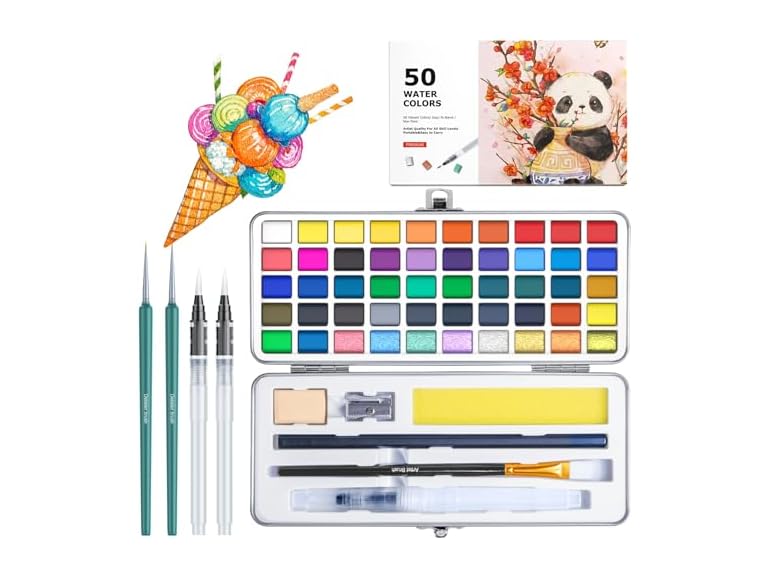 - Watercolor Paint Art Set 50 Colors: The portable watercolor set includes 38 regular colors, 4 fluorescent colors, 8 metallic colors, 3 water brush pen, 2 detail paintbrushes, 1 art sponge, 1 swatch sheet, 1 nylon paintbrush, 1 transparent palette and 8 watercolor papers. This art advantage watercolor kit was designed for both beginners and Professionals.