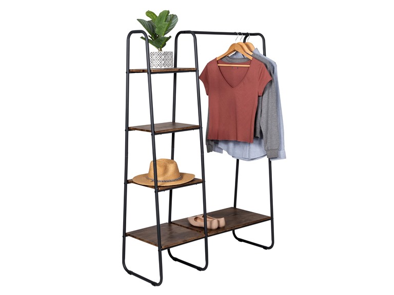 Artfully organize and show off your hanging clothes and folded garments with this black clothing rack. Its modern silhouette features rounded corners, a sturdy hanging bar for clothes, and 4 shelves. Shine a little light on this beauty and the color palette is equally as stunning. The assortment of natural-tone wood shelves not only boldly contrast the black frame but it gives this clothing display an extra kick of storage. The smaller shelves are a go-to for everything from organizing folded clothes to displaying accessories. Meanwhile, the large bottom shelf is the perfect place to slip storage baskets, shoes, or boots. This modern clothing rack instantly adds storage to both large and small spaces alike. Use it to plan your outfits, keep baby clothing in arm's reach, add clothing storage to a tiny apartment, or infuse your home with a touch of modern farmhouse style—the possibilities are endless!