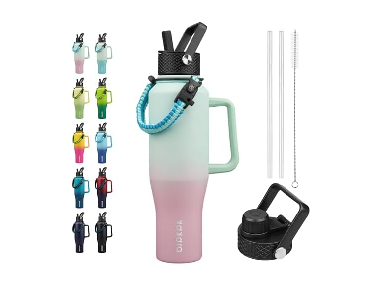 - PARACORD STRAP INCLUDED: With a paracord strap, you can enjoy its convenience in a fashion way. You will also get 1 straw lid for easy sip on-the-go, 1 spout lid for quick gulp, and 2 straws, 1 straw brush along with this thermos water bottle. Both lids are BPA free, leakproof, easy to use and clean.