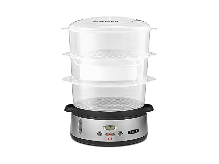 - (1) BELLA 9.5 QT Triple Tier Digital Food Steamer, Healthy Fast Simultaneous Cooking, Stackable Baskets for Vegetables or Meats, Rice/Grains Tray, Auto Shutoff & Boil Dry Protection, Stainless Steel