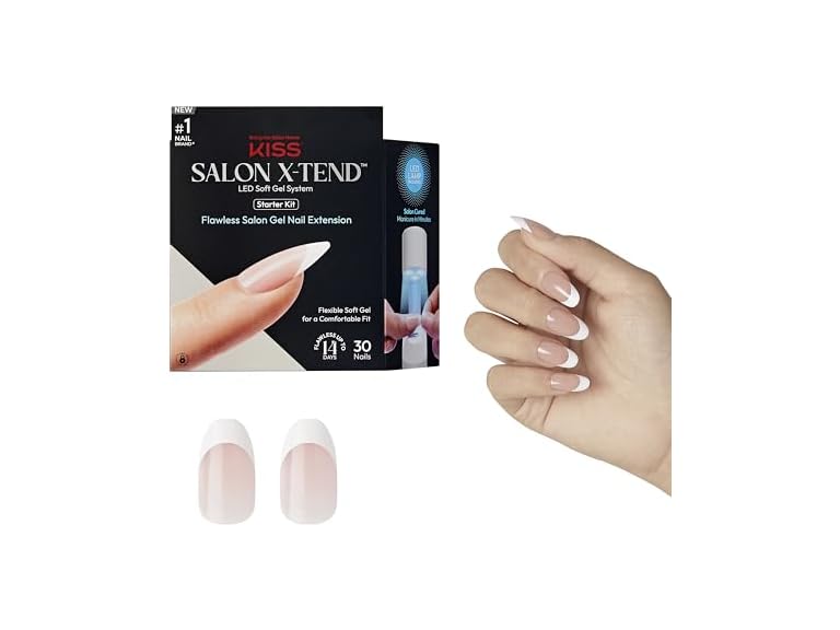 - (1) KISS Salon X-tend, Press-On Nails, Nail glue included, 'Pure', Light White, Medium Size, Oval Shape, Includes 30 Nails, 5Ml Led Soft Gel Adhesive, 1 Led Lamp, 1 Prep Pad, 1 Manicure Stick, 1 Mini File