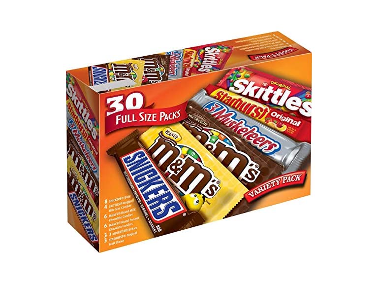 - Contains one (1) 30-count box of full-size, individually wrapped MARS Candies: (8) SNICKERS, (6) M&M'S Peanut Chocolate Candies, (6) M&M'S Milk Chocolate Candies, (4) SKITTLES Original Candy, (3) STARBURST Original Candy, and (3) 3 MUSKETEERS Chocolate