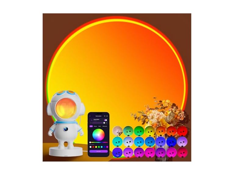 - 【Smart App & Button Control in Stylish Astronaut Design】Add a futuristic vibe to your space with this unique astronaut-shaped sunset light. Control it easily via the dedicated app or physical buttons—choose from 21+ colors and dynamic modes like fade, flash, and smooth transition. Features music sync, timer settings, and is perfect as a color-changing lamp for bedroom aesthetic upgrades, parties, or cozy nights in