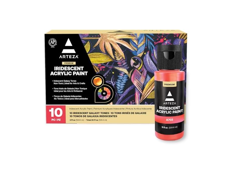 - (1) ARTEZA Iridescent Acrylic Paint Set – 10 Galaxy Tones, Shimmer Water-Based Paints for Canvas, Wood, Rocks, Fabrics, and Mixed Media Projects