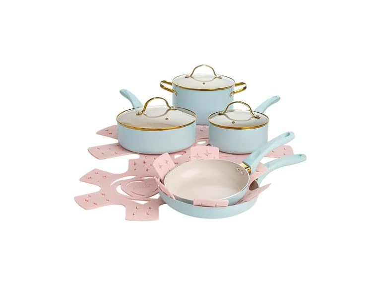 - COOK IN STYLE: The soft touch, stay cool handles provide comfort and control while your culinary creation sizzles. The multi-layer non stick coating allows for easy food release and clean up. Save your manicure, no scrubbing needed as this is a dishwasher safe pots and pans set, clean up is simple.