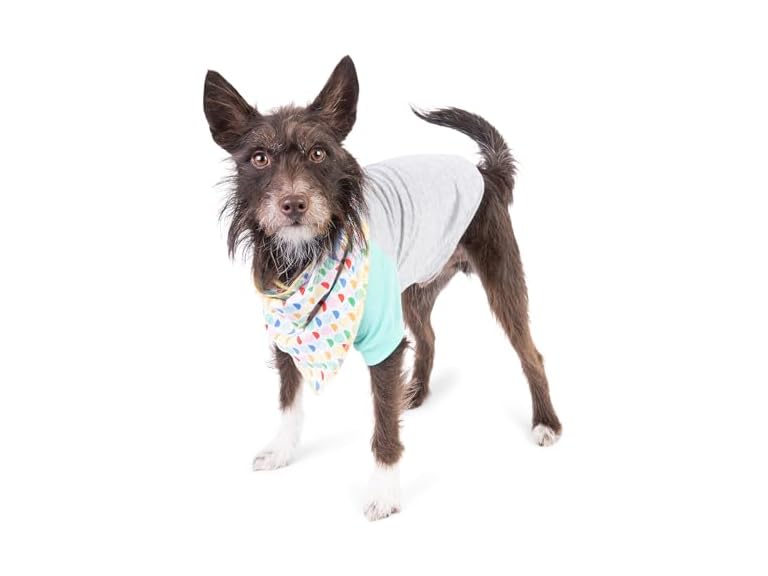 - 2 piece matching dog outfit set - This apparel set includes a grey, green, and white colorblock dog tee and a color coordinated colorful dog bandana in The Dodo abstract print