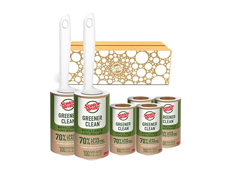 - (1) Scotch-Brite Greener Clean Lint Roller, Reusable Lint Rollers for Clothes, Furniture, and Pet Hair, Tidy Up Fabrics with a More Sustainable Fuzz Remover, 2 Roller, 4 Refills
