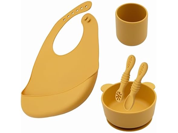 - BabyX Silicone Baby Starter Kit, 5 Pieces First Feeding Set, Including Training Spoon, Fork, Cup, Bib and Bowl, BPA-Free, Baby Utensils Supplies, Microwave/Dishwasher Safe