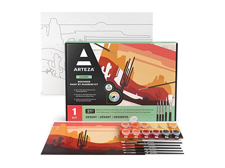 - (1) ARTEZA Paint by Number for Adults, 12x16 Inches, 21 Pieces, Desert Paint by Numbers Kit, Comes with 1 Canvas Panel, 12 Acrylic Paint Pots, 5 Paintbrushes, Art Supplies for Home & Office Wall Decor