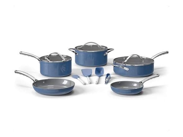 - Bakken 12-Piece Aluminum Cookware Set with Ceramic Nonstick Coating, PTFE & PFAS Free, All Stovetop Safe Up To 500°F, Pots and Pans Set with Lids, Silicone Utensils Included, Dishwasher Safe, Blue