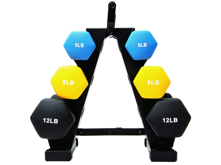 - 3 pairs of dumbbells in 5-pound, 8-pound, and 12-pound sizes. Ideal for resistance and other trainings