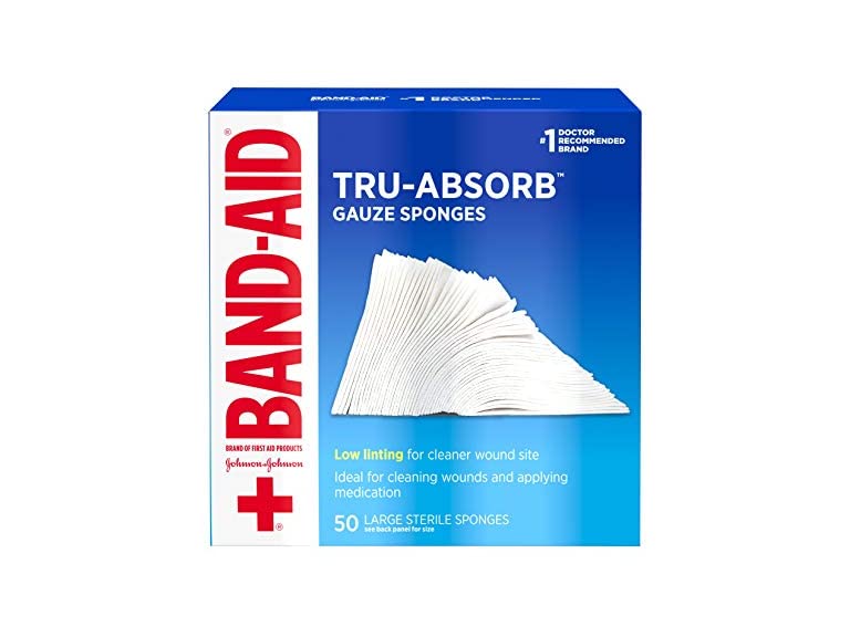 - (1) Band Aid Brand First Aid Products Tru-Absorb Sterile Gauze Sponges for Cleaning and Cushioning Wounds, Low-Lint Design, 4 inches by 4 inches, 50 Count