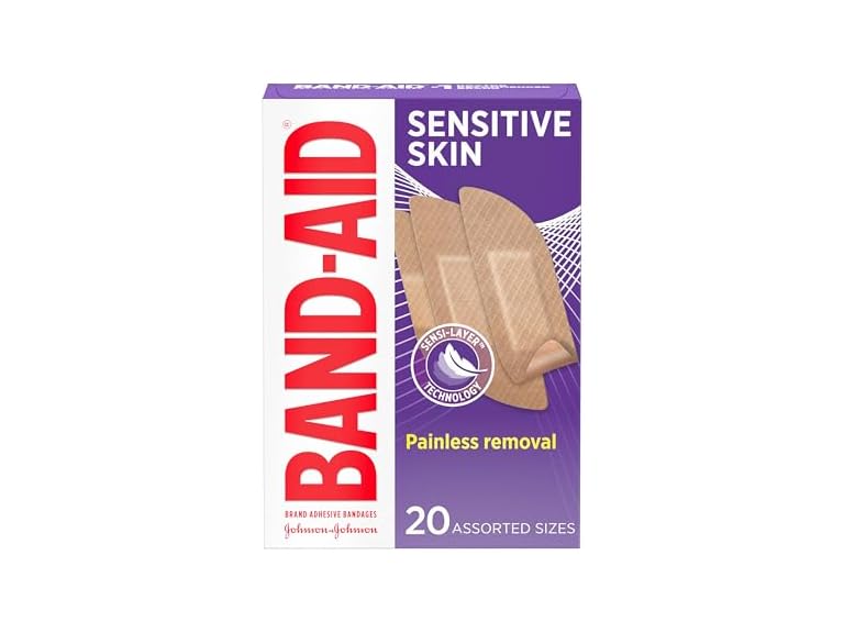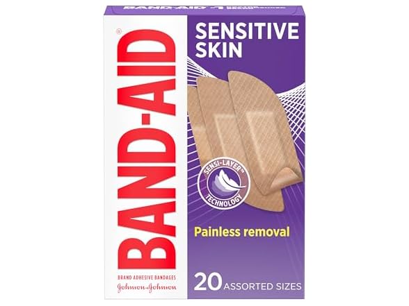 - (1) Band-Aid Brand Adhesive Bandages for Sensitive Skin, Hypoallergenic First Aid Bandages with Painless Removal, Stays on When Wet & Suitable for Eczema Prone Skin, Sterile, Assorted, 20 ct