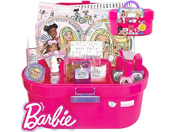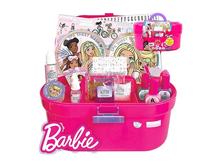 - Barbie Cosmetic Case by Horizon Group USA, DIY Beauty Kit for an at-Home Spa Day, Create Your Own Face Sheet Masks, Nail Art & Body Glitter, Includes Reusable Storage Case with Removable Tray