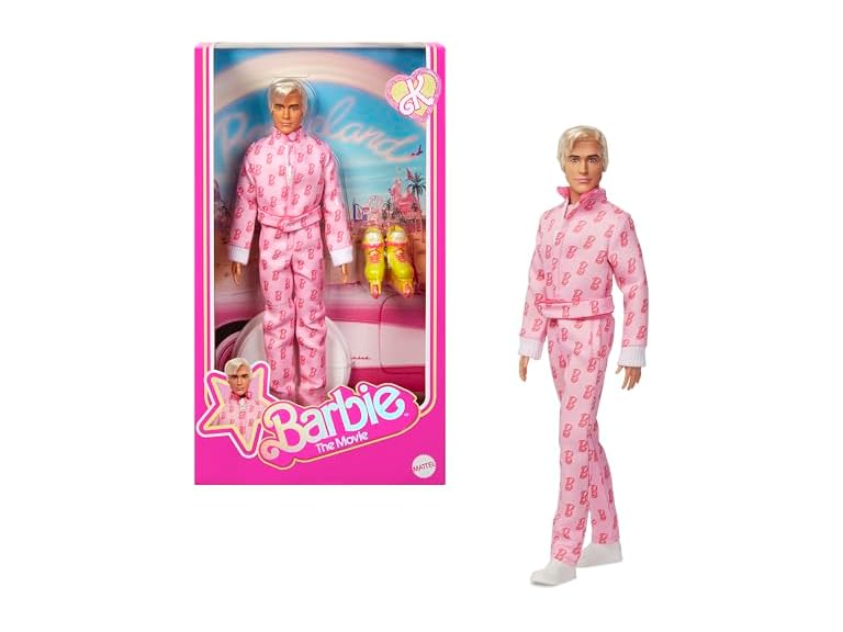 - (1) Barbie The Movie Ken Collectible Doll, Ryan Gosling as Ken Wearing Pink Jumpsuit with “B” Detail with White Sneakers and Multicolor Roller Skates
