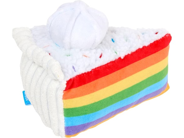 - Stuffed with Fluff & Squeaky Surprises: A true slice of joy, this rainbow cake plush is packed with fluffy filling and features two squeakers for double the fun—because no birthday is complete without a little noise.