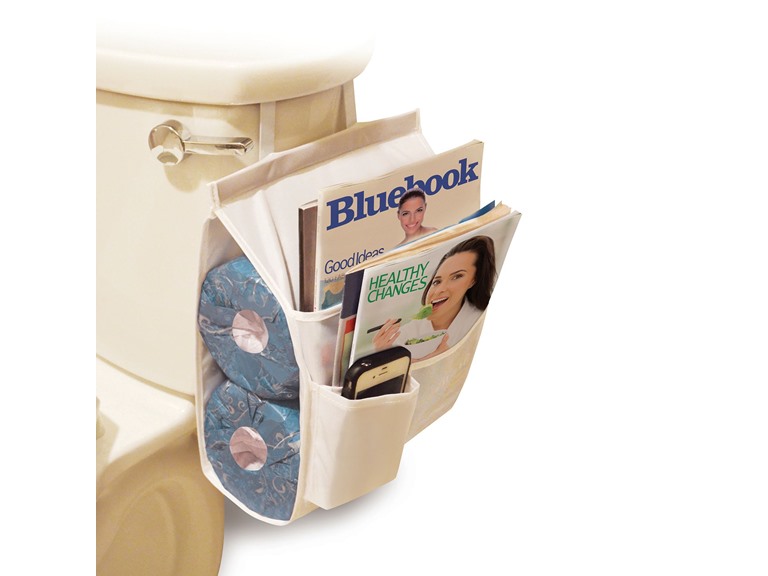 Handy storage for magazines and toilet paper. Hooks over your toilet bowl. No tools are required for installation. Includes pocket for cell phone. Also ideal for storing feminine hygiene products. Holds toilet paper and magazines Hooks over toilet bowl Include cell phone pocket No installation required.