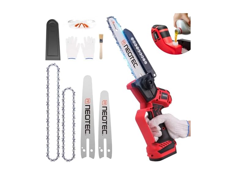 - 1000W Brushless Motor: NEOTEC brushless mini saw is equipped with a high-efficiency 1000W brushless motor, delivering powerful performance with a maximum chain speed of 15 m/s and a no-load speed of 26,000 RPM. It easily cuts through a 6-inch branch in just 4–7 seconds, saving you time and effort for a wide range of cutting tasks.