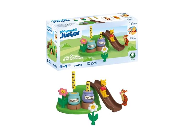 Disney's Winnie the Pooh and Tigger spent a delightful day in the Honey Garden! This toy set inspired by Disney promises endless fun and excitement. As Winnie and Tigger frolic in the garden, they indulge in sweet honey, pick colorful flowers, and joyfully zoom down the slide. What do you think they enjoy most? In Winnie the Pooh's and Tigger's Honey Garden, your child can explore a multitude of activities and carefully place the accessories in their correct openings: Where do the bee poles belong, and where do the flowers go? Press a bee pole into the honey pot, and watch it bounce back out. Who can make the pole jump higher? Wait, what's this? Are the flowers stuck in the honey? Your child can send Tigger and Winnie sliding down the slide. Who zooms faster into the Honey Garden? After an eventful day in the Honey Garden, the two friends can relax in Tigger's home. Encourage your child to weave exciting tales about Tigger and Winnie the Pooh! PLAYMOBIL JUNIOR - designed for our youngest PLAYMOBIL fans! Perfect for small hands and early toddler-friendly discoveries. With many exciting features such as stacking, puzzling, or sorting fun. Let your child aged 1-4 years take their first steps into the big PLAYMOBIL world with PLAYMOBIL JUNIOR! PLAYMOBIL JUNIOR keeps your child’s safety in mind: PLAYMOBIL JUNIOR is manufactured in the EU, BPA-free and designed without small parts that could pose a risk of being swallowed. All PLAYMOBIL JUNIOR playsets are also made from over 90% plant-based plastics, which can be traced back to materials left over from food or paper production using the mass balance approach used in the circular economy and in accordance with the ISCC-208 standard. These plastics are robust and easy to clean. For our PLAYMOBIL JUNIOR packaging, we use at least 90% recycled cardboard and 100% recycled paper and, where possible, avoid plastic. PLAYMOBIL JUNIOR - discover the world in a toddler-friendly way!