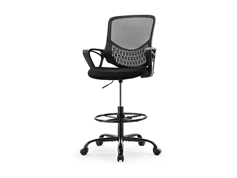- (1) JHK Home Office Computer Standing Desk Task Adjustable Foot Ring and Armrest, Breathable Mesh, Ergonomic Lumbar Support, 360° Swivel Rolling for Adult, Tall Drafting Chair, Black