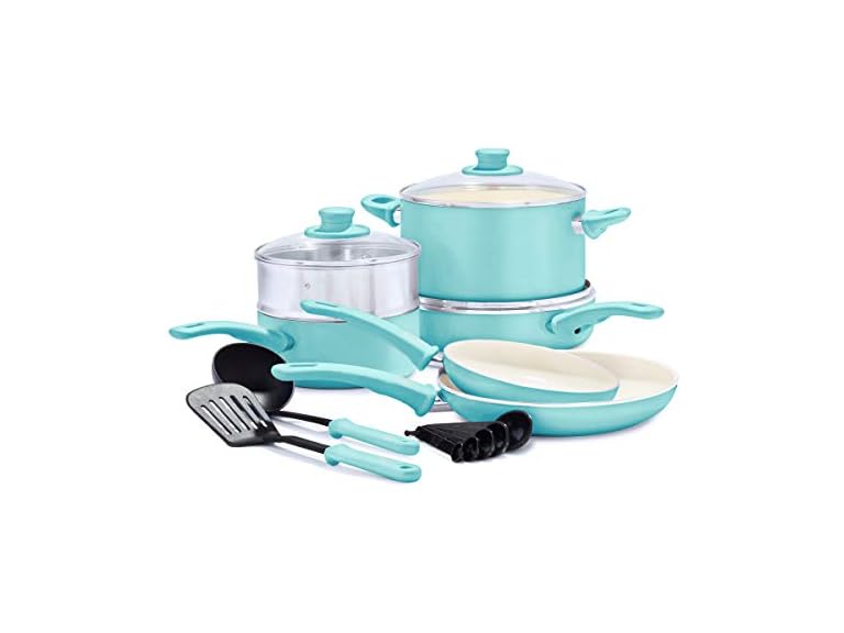 - (1) GreenLife Soft Grip Healthy Ceramic Nonstick 12 Piece Cookware Pots and Pans Set, PFAS-Free, Dishwasher Safe, Turquoise