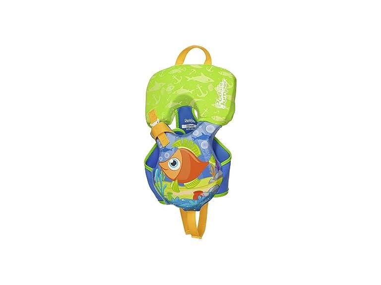 - Heads-Up oversized head support keeps head afloat and rescue handle on back of vest allows adults to easily pick up the child