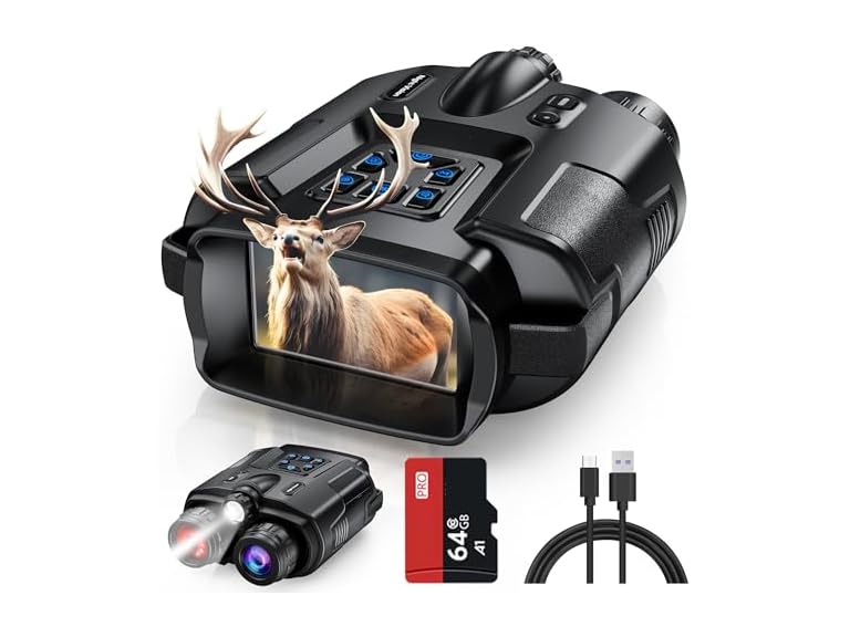 - 【Long-lasting Battery | 64GB Storage】 Night vision googles feature a built-in 5000mAh high-capacity battery with USB-C fast charging. It delivers 12 hours of operation with IR on and up to 18 hours with IR off. Comes standard with a 64GB high-speed TF memory card, making it an ideal choice for wilderness survival gear and security surveillance equipment.