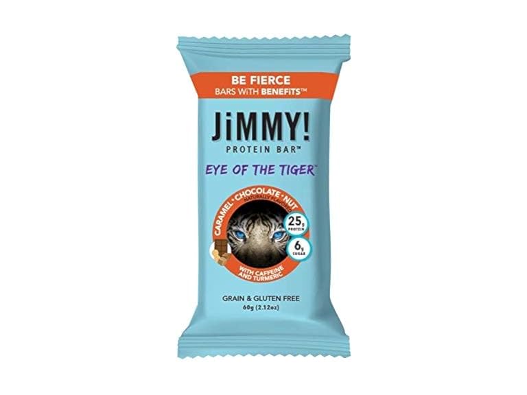 Rise up to the JiMMY! Eye of the Tiger bar! With guarana, a natural plant-based source of caffeine, and turmeric that may reduce inflammation, this performance bar was designed to help the warrior in all of us to go the distance with a whopping 25g of protein and only 6g of sugar. Perform, recover, and repeat with the delectable tastes of caramel, chocolate, and peanuts.
