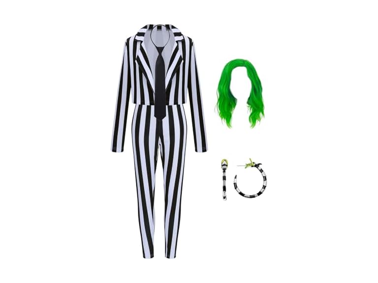 - Elegant Design: Black and white striped jackets with a front open design highlight an elegant appearance, making you more charming. The pants with elastic waistbands make you more comfortable to wear, the black tie features a zipper design, making it easy to wear and complementing the overall look, the green wig adds a touch of vitality and evil to your outfit, and the black and white snake earrings serve as the finishing touch to make your image more full.
