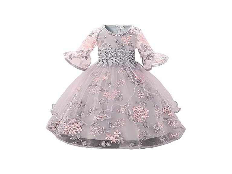 - (1) Qunsia Girls' Embroidered Lace Princess Wedding Baptism Dress Long Sleeve Formal Party Wear for Toddler Baby Girl (US, Age, 9 Years, 10 Years, Embroidered Grey)