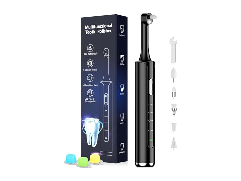 - Multi-occasional care: This tooth polisher has a built-in LED light that helps you see clearly, making it easier to clean every corner of your mouth without missing a corner. Whether you’re in a dim bathroom or just need better visibility, the light makes cleaning your teeth simple and effective. It also comes with a stylish box that’s easy to carry, so you can oral care at any time