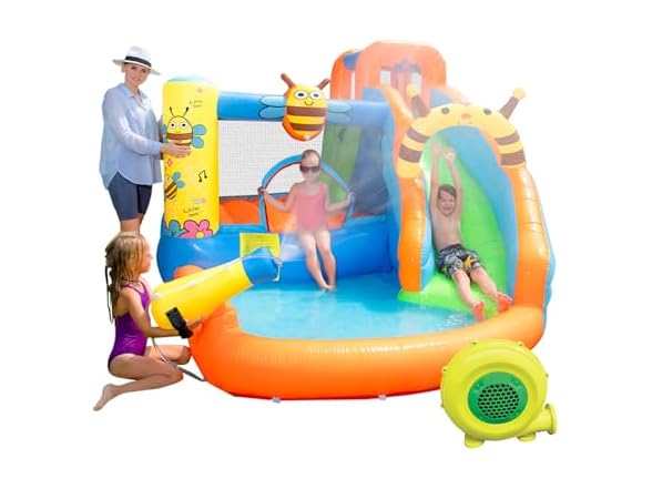 - 【Dry and Wet 】:The bounce house water slide is wet and dry available. In summer, this water slide have a water spray setting on the top of the slide, your kids can enjoy the fun of playing water in the pool. In winter, you can keep the bounce house indoors, and the kids can still enjoy the fun of bouncing and sliding.