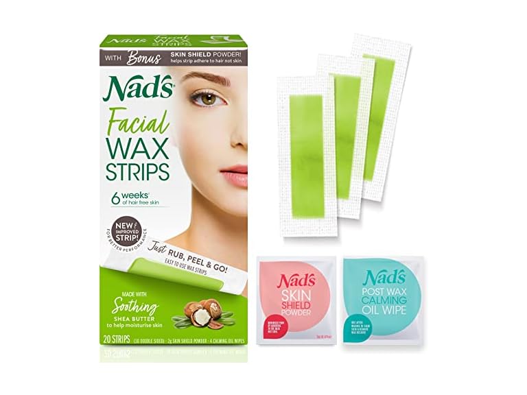 (1) Nad's Facial Wax Strips - Hypoallergenic All Skin Types - Facial Hair Removal For Women - At Home Waxing Kit with 20 Face Wax Strips + 4 Calming Oil Wipes + Skin Protection Powder