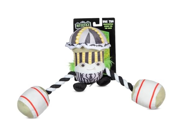 Get ready for a pawsitively spooky good time with your pup! Movie fans, now you can celebrate your love of iconic films with the whole family – including your fur-babies! This BEETLEJUICE™ Carnival Rope Dog Plush Toy is the perfect collectible pet toy inspired by the BEETLEJUICE™ film. Your dog will love chewing and playing with this fun extra-long dog toy, and you’ll love the hours of endless entertainment of celebrating your favorite spooky and kooky film with your pup. Each arm is made of rope with a squeaker in the hand that your dog will go crazy for. This BEETLEJUICE dog toy is great for showing off your love of all things spooky and kooky, from Halloween gifts to celebrating your own classic movie night. Give one to your pooch to stay entertained all night long while you curl up with your favorite movie. BEETLEJUICE and all related characters and elements © & ™ Warner Bros. Entertainment Inc.