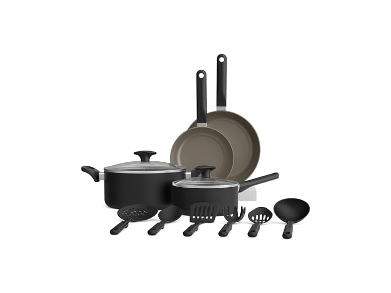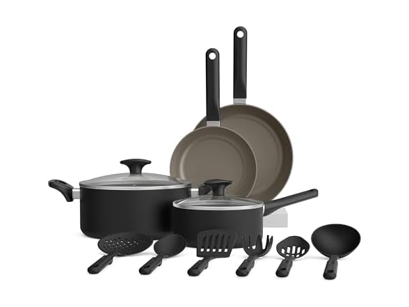(1) BELLA 12 Piece Cookware SetCeramic Nonstick Coating, Dishwasher & Oven Safe, All Stovetops Compatible, Tempered Glass Lids and Cool Touch Handles, Black