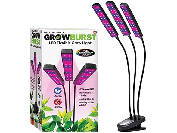 - Three ways to mount the Growburst. Comes with Table-top stand for portability; clip-on product on edges if you’re out of space; or mount item directly on preferred location using screws (hardware included in every Growburst purchase).