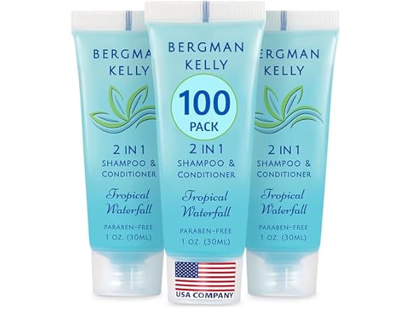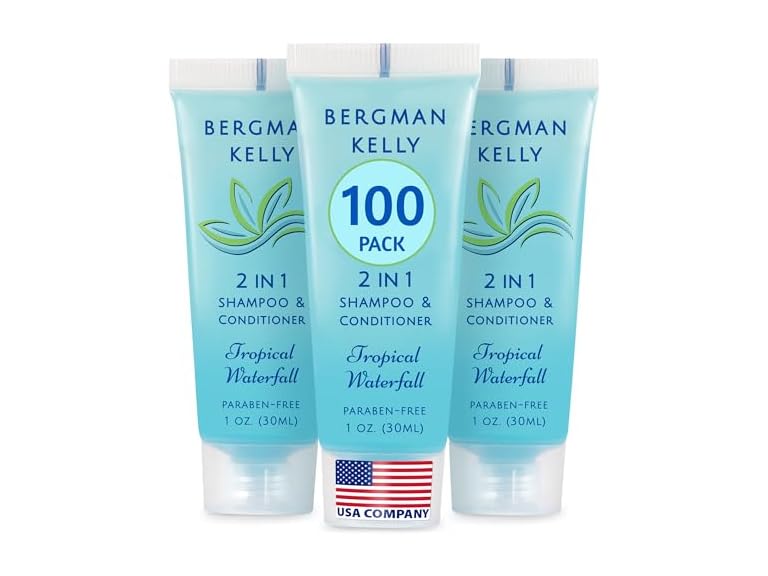 - (1) Bergman Kelly - Travel Size 2 in 1 Shampoo & Conditioner - 1 fl oz, 100 PK, Tropical Waterfall - Delight Your Guests w/Invigorating & Refreshing Shampoo Amenities - Small Hotel Toiletries in Bulk