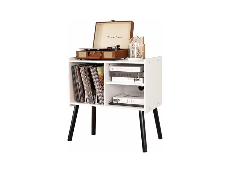 - [Sturdy Support, Unrivaled Quality] Made from premium particleboard with sturdy solid wood legs, this vinyl record player stand is designed for long-lasting use. It holds up to 100 lbs, ensuring your record player and albums are stored securely. Perfect for protecting your valuable collection!
