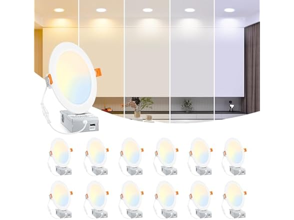 - (1) BesLowe 12 Packs 6 Inch 5CCT LED Recessed Ceiling Lights Ultra-Thin with Junction Box, 12W 150W Eqv, 3000K/3500K/4000K/5000K/6500K, 1200LM Dimmable Canless Downlights