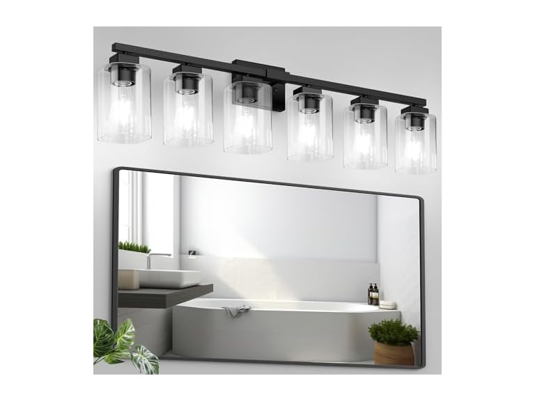 - Sleek Modern Design: Elevate your space with BesLowe 6-light bathroom vanity light, expertly crafted with clear glass shades and a sophisticated matte black finish. This versatile fixture seamlessly complements any decor style, from contemporary chic to timeless traditional, enhancing your home’s ambiance