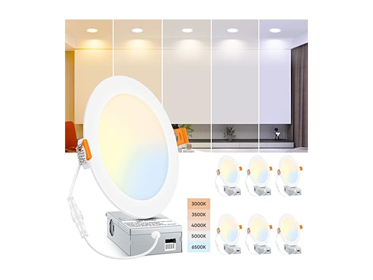 - 5 Color Temperatures in One & Dimmable: The LED recessed lighting offers 5 different color temperatures: 3000K (soft white), 3500K (warm white), 4000K (neutral white), 5000K (daylight white) or 6500K (cool white). Simply slide the button on the junction box to set your desired light color before installation. It is also compatible with most dimmers to achieve dimming capacity from 5% to 100% (dimmer not included)
