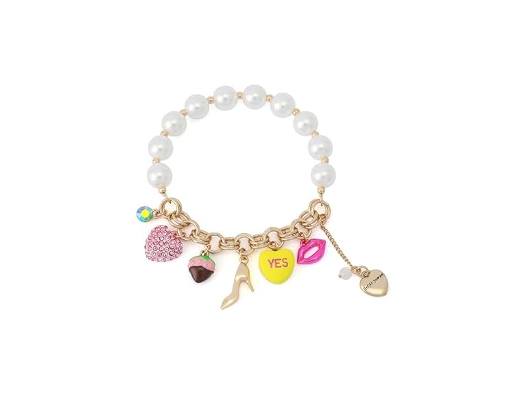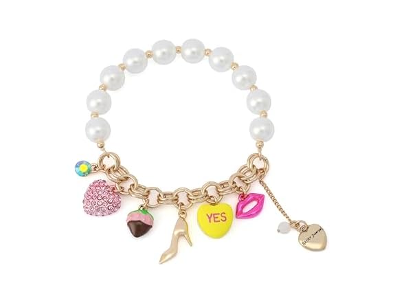 - TRENDY BRACELETS : Playful stretch bracelet featuring gold-tone finish chain with pearl stretch strand and mixed whimsical charms. Charms include candy heart, fancy high heel, pavé heart, chocolate dipped strawberry and lips.
