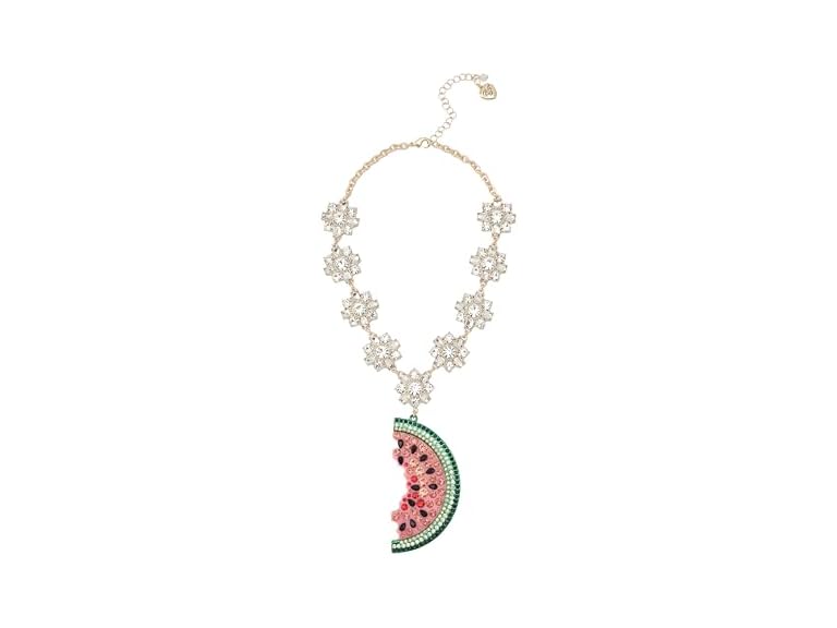 - TRENDY NECKLACES : Welcome to Betsey's backyard with this whimsical necklace featuring refined chain with sparkly stone clusters and vibrant watermelon pendant. Adorned with multi-colored stones.