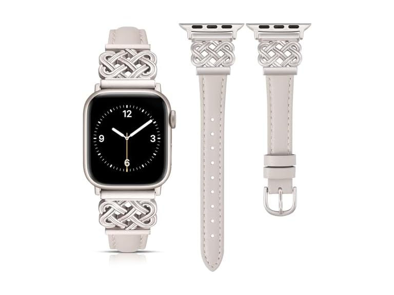 - (1) TOYOUTHS Compatible with Apple Watch Bands Women 42/44/45/46/49mm Dressy Slim Leather Strap with Celtic Knot Interlock Buckle Bracelet for iWatch Series 11 10 9 8 7 6 5 4 SE/Ultra 3 2 1, Starlight