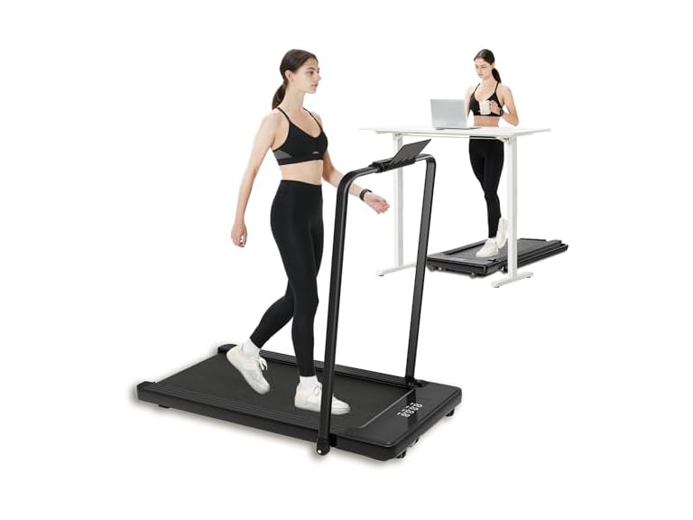 - 【NO NEED ASSEMBLE & SPACE SAVER DESIGN】 This 2 in 1 treadmill arrives fully assembled and can be used directly after unboxing.Foldable design and transportation wheels allow for easy mobility and portable foldable treadmill for storage,fold it up and walk away-in one easy step,pefect for home , apartment, office use.Sturdy steel frame, durable to use; support maximum weight up to 265lb