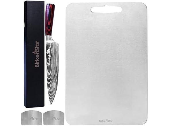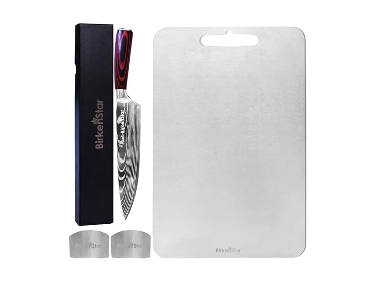 - (1) BirkenStar Titanium Cutting Board with Premium Kitchen Knife and 2 Finger Guards Set, Chefs Knife, Large, Non Toxic, Metal Cutting Boards for Kitchen, Stainless Steel, Chopping, Meat Knife with Ergonomic Handle