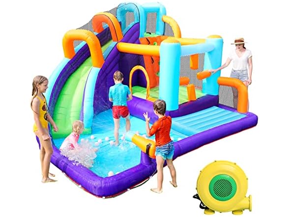 - 【Multifunction Water Park】Fancy the obstacle wall connects the air cushion and the large bouncing area, then climb the climbing wall ,the long water slide with the spray water, slide down the splash pool,and you will find,the water cannon spray water for you too, It is like a water park,colorful design and rich gameplay will attract your children to stay in it for hours.