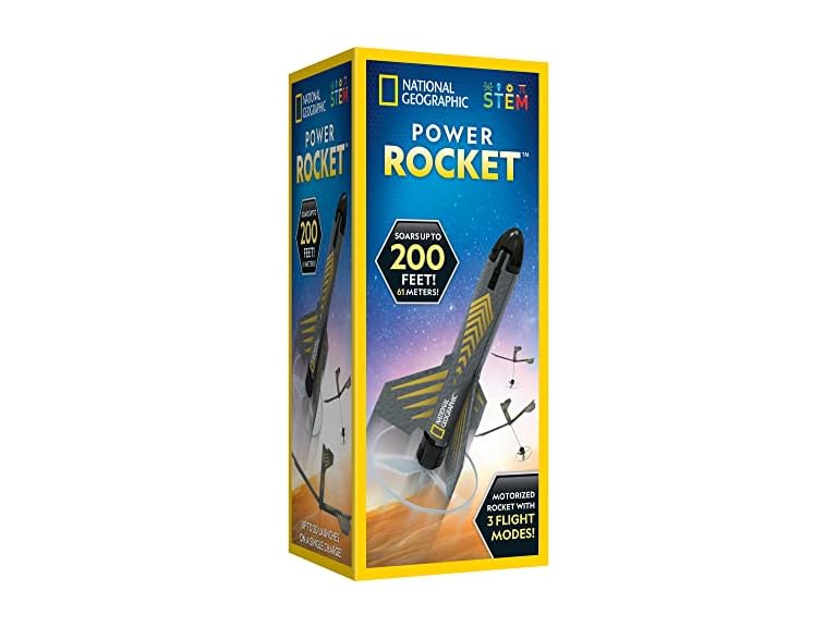 National Geographic is taking outdoor fun to heights up to 200 feet with the motorized Power Rocket, an exciting and innovative new way for kids to experience the wonder of flight! The Power Rocket is no ordinary model rocket--with its powerful electric motor, it can launch up to 200 feet in the air! Unlike a traditional stomp rocket, the Power Rocket's electric motor is self-powered by a rechargeable lithium-ion battery, providing up to 20 launches on a single charge. The Power Rocket science kit from National Geographic includes everything you need, including: Power Rocket with rechargeable battery, Rocket launch pad, Charging cable, 3 decals to customize your rocket, detailed instructions & learning guide. Recharging your Power Rocket is easy using the included cable. At just 25 minutes to fully recharge, and with up to 20 launches per charge, the National Geographic Power Rocket kit will quickly become a favorite for outdoor and backyard fun! Launching the Power Rocket couldn't be easier. Once fully charged, simply place the rocket on the included launcher, then press the launch button one, two, or three times to set your flight time. Then, step back and prepare for launch! Once the Power Rocket reaches its apex, its rotor blades release, bringing it back to the ground safely and gently. And with up to 25 launches per charge, kids will enjoy sending the Power Rocket up again and again. National Geographic also includes a detailed learning guide that teaches kids about the science behind flight, aerodynamics, and space. National Geographic Toys makes the highest quality hands-on science toys, and all products are backed by exceptional service. About the National Geographic Society: With a mission to inspire people to care about the planet, the National Geographic Society is one of the world’s largest nonprofit scientific and educational organizations.