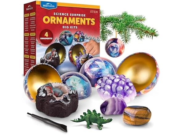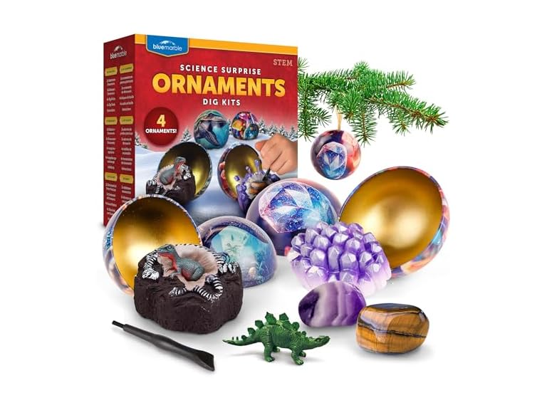 - (1) Blue Marble Science Surprise Christmas Ornament Kit for Kids- 4 Dig Kit Ornaments with Gemstone and Dinosaur Dig Bricks, Dino Digging Toys for Kids, Gem Excavation Stocking Stuffer for Boys and Girls